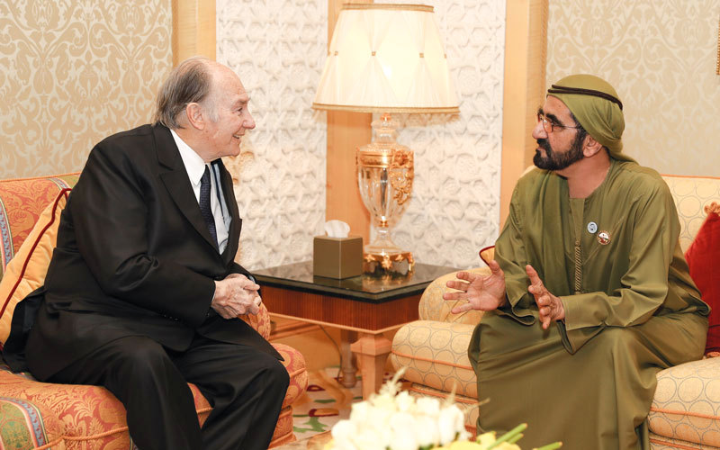 إلى ذلك، استقبل صاحب السمو الشيخ محمد بن راشد آل مكتوم، زعيم الطائفة الإسماعيلية حول العالم، الآغا خان الرابع، الذي تبادل مع سموه الحديث حول عدد من المسائل والقضايا الخيرية والإنسانية، وسبل مد جسور للتعاون والتنسيق بين مؤسسة الآغا خان للتنمية والمؤسسات الإنسانية والخيرية في الدولة، من أجل تفعيل الأعمال الإنسانية والتنموية التي تقوم بها في البلدان الفقيرة، ومساعدة الشعوب المحتاجة.