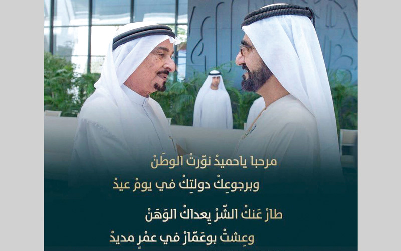 ونشر صاحب السموّ الشيخ محمد بن راشد آل مكتوم، على حسابه على «تويتر»، صورة تجمعه بصاحب السموّ حاكم عجمان، مرفقة ببيتي شعر يقول فيهما سموّه: «مرحباً يا حميد نورت الوطن.. وبرجوعك دولتك في يوم عيد.. طار عنك الشر يعداك الوهن.. وعشت بوعمار في عمر مديد».