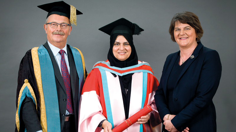 حصلت المدير التنفيذي لتكتل الشركات التجارية متعدد الاختصاصات، «مجموعة عيسى صالح القرق» الدكتورة رجاء عيسى صالح القرق، على درجة الدكتوراه الفخرية من جامعة «كوينز» في بلفاست تقديراً لدورها الرائد في مجال إدارة الأعمال والعلاقات التجارية، لتنضم بذلك إلى 12 شخصاً كانوا قد حصلوا على درجات فخرية من الجامعة هذا الصيف، من بينهم البروفيسور مارتن ميهان، الرئيس الـ27 لجامعة ماساتشوستس، وباحثون معروفون عالمياً، إضافة إلى عدد من القادة الرواد في مجال الأعمال والتجارة.