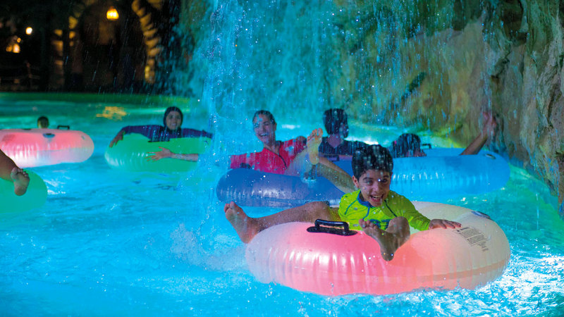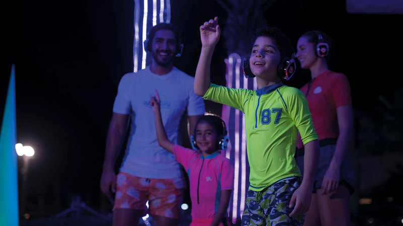ويحظى الضيوف الصغار خلال «ليالي الأضواء» بفرصة القفز في الممر الأسطواني المضاء والسباحة في «نهر النيون»، الأول من نوعه في الإمارات.