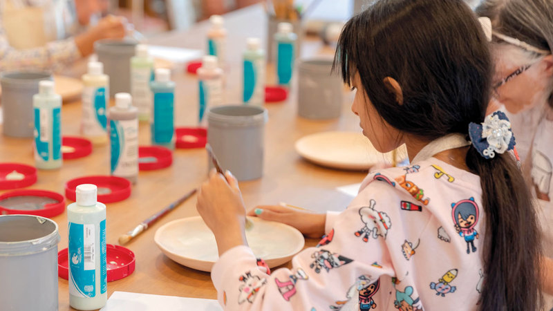 وكشف الأطفال عن نتائج ما تعلموه في «محترف الخزف»، من خلال عرض أعمال تمثلت في أطباق وأكواب خاصة بهم، تميزت برسوماتها المرحة وألوانها الزاهية. وهدفت هذه الورشة إلى تعليم الطفل أهمية أن تكون له هويته الخاصة وبصمته، وشخصيته المختلفة التي تميزه عن غيره، بعيداً عن التقليد وقريباً من الابتكار والإبداع.