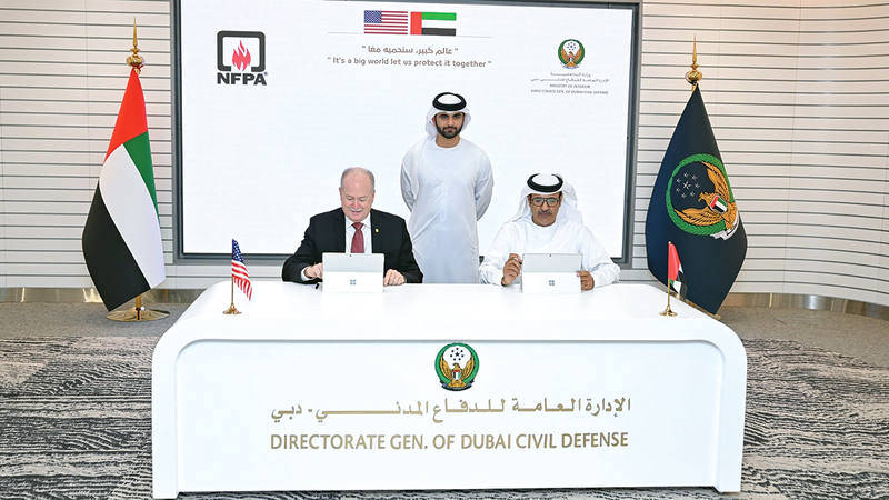 شهد سمو الشيخ منصور بن محمد بن راشد آل مكتوم، رئيس اللجنة العليا لإدارة الطوارئ والأزمات والكوارث في دبي، توقيع اتفاقية تعاون بين الإدارة العامة للدفاع المدني في دبي والهيئة الوطنية للحماية من الحرائق، وهي الأكبر عالمياً في مجال الإطفاء، ومقرها الولايات المتحدة الأميركية، ووقع الاتفاقية، المدير العام للإدارة العامة للدفاع المدني بدبي، الفريق خبير راشد ثاني المطروشي، والرئيس والمدير التنفيذي للهيئة الوطنية للحماية من الحرائق، جيم بولي، بحضور مساعدي المدير العام وعدد من كبار الضباط ومديري الإدارات بالإدارة.