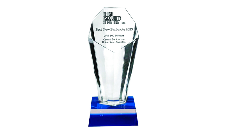 حصل مصرف الإمارات العربية المتحدة المركزي على جائزة «أفضل إصدار لورقة نقدية لعام 2025» من فئة 500 درهم، في منطقة أوروبا والشرق الأوسط وإفريقيا، جاء الإعلان عن الجائزة خلال مؤتمر «الطباعة عالية الأمان لمنطقة أوروبا والشرق الأوسط وإفريقيا» (High Security Printing EMEA) الذي عُقد في مدينة بازل السويسرية، مطلع شهر فبراير الجاري، حيث تتميّز الورقة النقدية من فئة 500 درهم بتصميم يعكس مسيرة دولة الإمارات في مجال الاستدامة، ويجسّد التزام المصرف المركزي الراسخ بتعزيز الحلول المستدامة في القطاع المالي، ويأتي هذا الإنجاز الجديد للمصرف المركزي في إطار حرصه على استخدام أحدث المواصفات الفنية والعلامات الأمنية المتطورة في تصميم الورقة النقدية الجديدة من فئة 500 درهم، التي تتميّز بتصاميم ثلاثية الأبعاد وميزات أمنية متطورة وتقنيات حديثة، واستخدم المصرف المركزي هذه التقنيات في فئة 1000 درهم أيضاً، وقد فازت بجائزة «أفضل إصدار لورقة نقدية لعام 2023»، ما يؤكد ريادة دولة الإمارات كأول دولة في منطقة الشرق الأوسط تستخدم أكبر عدد من شرائط الرقائق في أوراقها النقدية، وتتم طباعة هذه الورقة النقدية من الإصدار الثالث من قبل شركة «عملات للطباعة الأمنية»، التابعة للمصرف المركزي، ودخلت حيز الاستخدام في 30 نوفمبر 2023.