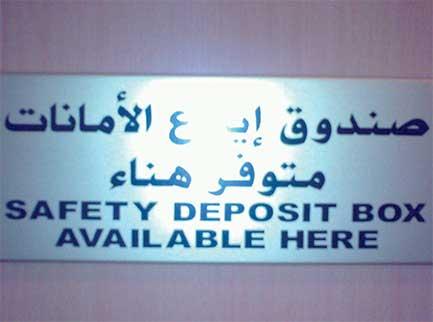 علقت إحدى الجهات لوحة إرشادية، احتوت على كلمات غير صحيحة، على الرغم من كتابتها صحيحة باللغة الإنجليزية، وهي «صندوق إيداع الأمانات متوفر هناء» بدلاً من «صندوق إيداع الأمانات موجود هنا» حيث احتوت كلمة هنا على حرف زائد هو الهمزة، إضافة إلى أن العبارة قد تكون غير مفهومة لمن يقرأها.