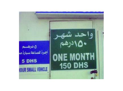 رفع صاحب بناية لوحة إرشادية للإعلان عن تأجير السيارات، احتوت على كلمات عربية غير صحيحة، إذ كتب في الأولى «واحد شهر 150 درهم» والصحيح «قيمة إيجار الموقف 150 درهماً شهرياً» وكتب في الثانية «5 درهم أجرة للساعة سيارة صغيرة» والصحيح «أجرة السيارة الصغيرة 5 دراهم في الساعة».