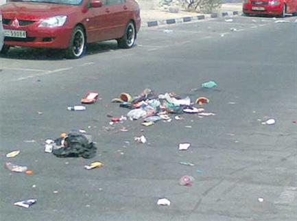 ألقى شخص كيس قمامة في وسط طريق، ما أدى إلى تناثرها أمام البيوت، بعد أن داستها إطارات السيارات المسرعة، وهذا المنظر غير حضاري، ويجب على جهات الاختصاص متابعة الطرق وتنظيفها أولاً بأول، حفاظاً على الصحة العامة.