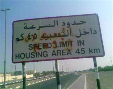 رفعت إحدى الجهات لوحة إرشادية في منطقة الصاروج في العين، لتحديد السرعة داخل الشعبية، لكن أحد الأشخاص كتب عليها ما أدى لتشويهها، والإساءة للمنظر الحضاري، إضافة إلى أن بعض السائقين قد يجدون صعوبة في قراءتها ما يؤدي لوقوع حوادث مرورية.