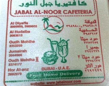 على علبة وجبات لمطعم في دبي كتبت أسماء المناطق بطريقة خطأ، وكأننا في بلد آخر، فبدلاً من أن يكتب «الضيافة، عود ميثاء، هور العنز»، كُتب «الديافة، عود ميثا، هور الأنز».