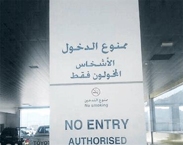 وُضعت لافتة في محطة لصيانة السيارات تمنع الدخول لغير الأشخاص المسموح لهم، لكن اللافتة احتوت على خطأ فادح في كتابة كلمة الأشخاص، حيث كتب «الأشخاس المخولون فقط»، بدلاً من أن تكتب «الأشخاص المخولون فقط»، ولم يتم تدارك هذا الخطأ وتصحيحه، فبقي شاهداً على الإهمال والاستهزاء باللغة العربية.