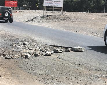 يعاني الشارع الواقع عند بلدية العقير في الفجيرة من كثرة الحفر والمطبات وتراكم الحجارة على أطرافه، على الرغم من أن هذا الطريق يؤدي مباشرة إلى البحر في منطقة قدفع وهو مكان يرتاده العديد من المواطنين والمقيمين، الذين يعانون من تلك المطبات التي تتلف سياراتهم ذهاباً وإياباً.