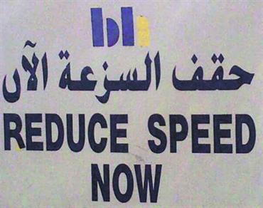 تريد هذه اللوحة تنبيه السائقين إلى ضرورة خفض سرعة سياراتهم في هذا المكان، فهل أفلحت، أم أنها نجحت في أمر واحد، هو التعدي على لغتنا العربية ؟