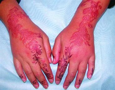 وأوضحت أن «هذه المادة تجعل النقوش داكنة اللون، وطويلة الأمد، في حين لا تحتوي العبوات على بطاقة للتعريف بالمحتويات، وإرشاد المستخدم بطريقة الاستخدام، أو التحذير من خطورتها»، مؤكدة أنها «قد تسبب الحساسية، والفشل الكلوي، وربما الموت أحياناً».