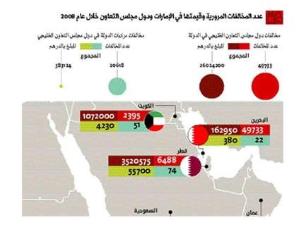 وبلغ عدد المخالفات المرورية التي ارتكبتها مركبات مسجلة في دول مجلس التعاون الخليجي، في الإمارات، 49 ألفاً و733 مخالفة خلال العام .2008