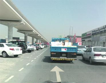 دخلت هذه الشاحنة المفتوحة إلى شارع الشيخ زايد في دبي، قادمة من منطقة القوز الصناعية، من دون أن يلقي سائقها بالاً، لما قد ينجم عن حمولتها المكشوفة من السوائل سريعة الاشتعال، من مخاطر تمس حياة الآخرين، خصوصاً أنها -أي الحمولة- عرضة لأشعة الشمس المباشرة.