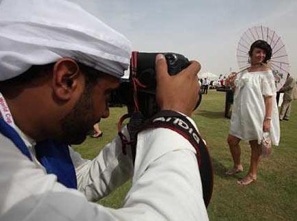 مصور يحاول إلتقاط صورة لزائرة في كأس دبي العالمي للخيول-باتريك كاستيلو