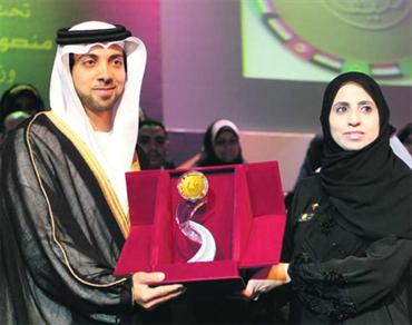 منصور بن زايد يسلم الجائزة لإحدى المكرّمات. تصوير: مجدي إسكندر