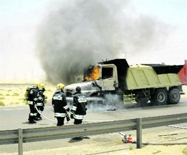 شب حريق في شاحنة زنة 18 طناً محملة بالرمل الأحمر، كانت متجهة إلى دوار مصنع السماد في مدينة العين، سالكة طريق أبوظبي. وتمكن رجال الإنقاذ الفني والتدخل السريع التابع لقسم الطوارئ والسلامة العامة في شرطة أبوظبي في مدينة العين من السيطرة على الحريق، الذي اندلع في مقدمة الشاحنة بسبب ماس كهربائي في أثناء قيام السائق بتشغيل جهاز التكييف، وفقاً لسائق الشاحنة نفسه.