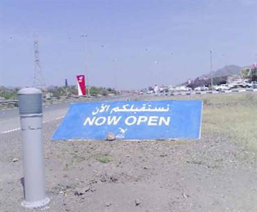 وضعت محطة بترول الإمارات على طريق مزيرع- حتا لافتة ترحيبية لعابري الطريق، ومرتادي المحطة، في إشارة الى افتتاحها وبدء العمل فيها. ولكن وضع اللافتة إلى جانب الطريق، عوضاً عن استخدام المنصب المخصص لها، أفقدها معناها، لأن كل من يراها يظن أنها سقطت من مكان ما.