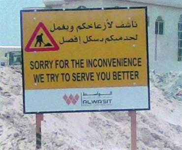 علقت شركة مقاولات لافتة تحذيرية، جاءت فيها أخطاء كثيرة، مثل «ناشف لأزعاخكم وبغمل لحدميكم دسكل افصل»، ما يدل على عدم الاهتمام باللغة العربية تماماً.