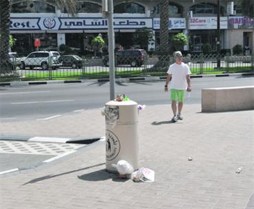 امتلأت سلة مهملات بالنفايات في أحد شوارع دبي ولم يتم تفريغها، ما أدى إلى إلقاء القمامة في الشارع، وتالياً تهديد الصحة العامة وتشويه المظهر الحضاري للمدينة، ولذا يجب على الجهات المختصة الحرص على نظافة شوارع دبي حفاظاً على صحة المواطنين والمقيمين والمنظر الجمالي.