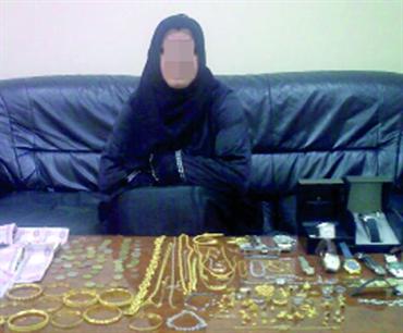 المتهمة وأمامها جانب من المسروقات. من المصدر
