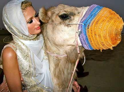 باريس هيلتون تحتضن "سفينة الصحراء" خلال جولة سياحية لها في دبي-أ.ف.ب