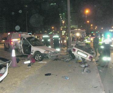 وعزا الفلاسي الحادث الى سرعة السائق «إذ أدت إلى انحراف المركبة إلى اليمين بشكل مفاجئ، ومن ثم صدمت الرصيف الفاصل بين الشارعين، قبل ان تواصل اندفاعها لمسافة 50 متراً، لتصطدم بعمود إنارة، مما تسبب في انشطارها إلى جزءين، مشيراً إلى أن السائق (25 سنة) ومرافقه توفيا على الفور في مكان الحادث، متأثرين بإصاباتهما.