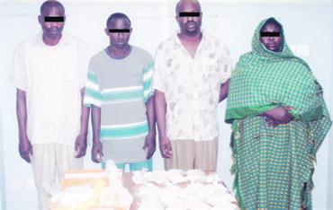 المتهمون الأربعة وأمامهم المخدرات المضبوطة. من المصدر