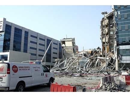 نجا 11 عاملا فى حادث انهيار واجهة مبنى قيد الإنشاء في التشطيبات النهائية مكون من ستة طوابق ظهر اليوم بديرة قرب فندق رامادا كونتنتال مقابل شرطة دبى كانوا متواجدين فى المبنى لدى ملاحظتهم بوادر الإنهيار .