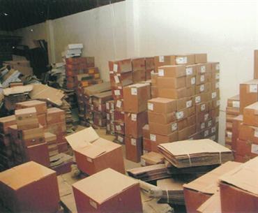صناديــق تنتظــر تغليفها بعلامـة تجارية مقلّدة. من المصدر
