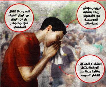 وتفصيلاً، أكـد درويـش أن فــيروس «إتش1 إن1» يحمل تركيبة جينية قريبة جداً من فيروس الأنفلونزا الموسمية، وتبلغ نسبة التقارب بينهما 80٪، كما أن أعراض الإصابة متشابهة تماماً بين الفيروسين، وتتمثل في ارتفاع درجة الحرارة، والزكام، والسعال، وآلام الجسم، بالإضافة إلى أعراض الجهاز الهضمي مثل القيء، والإسهال.