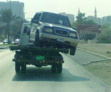 وضع سائق مركبة متهور سيارة معطلة فوق مركبته لنقلها إلى إحدى الورش، إلا أنها أوشكت على السقوط في الشارع، ما يؤدي إلى وقوع حادث سير يذهب ضحيته سائقون وركاب، لذا يتعين على الجهات المختصة معاقبة مثل هؤلاء السائقين لمنعهم من تكرار ذلك مستقبلاً.