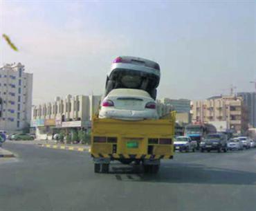 وضع سائق شاحنة سيارتين فوق مركبته، من دون توفير وسائل الأمان لنقلهما، معرضاً حياته وحياة قائدي السيارات المارة على الطريق إلى الخطر في حال سقوطهما أو إحداهما في الشارع، لذا يتعين على الجهات المختصة مخالفة مثل هؤلاء السائقين لمنعهم من تكرار ذلك مستقبلاً.