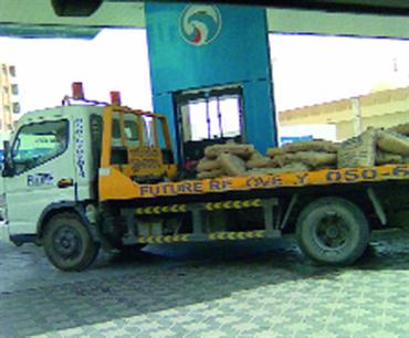 وضع سائق شاحنة مخصصة لقطر المركبات، كمية من عبوات الاسمنت فوق مركبته، من دون وضع غطاء، أو حواجز لحماية المارة وقائدي السيارات من الغبار المتطاير منها، ولذا يتعين على الجهات المختصة مراقبة الطرق لفرض غرامات على السائقين المخالفين.