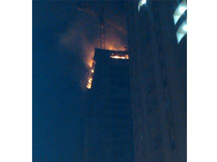 وهرعت على الفور سيارات الاطفاء إلى المكان، وواجه رجال الدفاع المدني صعوبة في اخماد الحريق الذي اندلع في الطابقين الأخيرين من البرج، إذ تمثل الخطر الأكبر في انصهار حديد الرافعة الموجودة في أعلى المبنى، إلا أن القوى الأمنبة تمكنت من نصب رافعة أخرى لتساعد على تثبيتها خوفا من وقوعها.