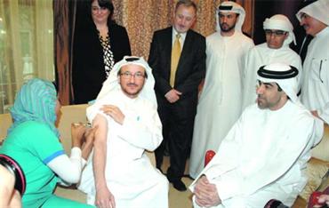 المدير التنفيذي لوزارة الصحة يأخذ لقاح فيروس «إتش1 إن1» وإلى جانبه وزير الصحة. وام