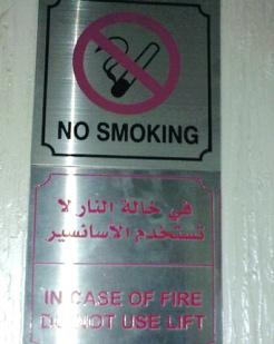 علقت تلك اللوحة في إحدى البنايات محذرة من عدم استخدام المصعد في حالة الحريق، ولكنها كتبت «في خالة النار» بدلاً من «في حالة اندلاع حريق».