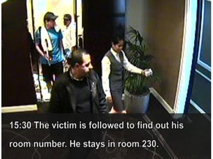 المبحوح أثناء توجهه إلى غرفته ويظهر خلفه شخصان من المشتركين في جريمة الاغتيال. أ.ف.ب
