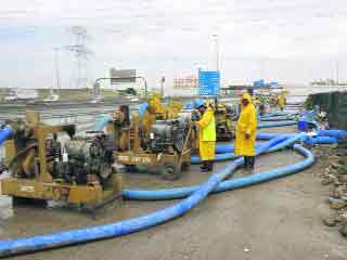 مضخات «الطرق» تسحب المياه من إحدى البرك. من المصدر