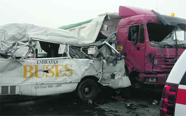 وكان طريق أبوظبي ـ دبي شهد في مثل هذا اليوم من عام ،2008 وفي التوقيت نفسه، حادث تصادم واحتراق 40 سيارة، بسبب الضباب الكثيف، ماخلّف ثلاث وفيات وإصابة .284