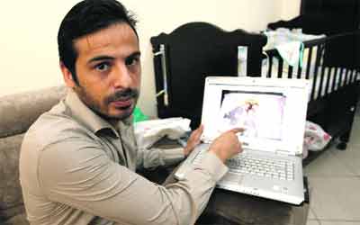 والد التوائم يشير إلى صور طفليه المتوفيين. تصوير: لؤي أبوهيكل
