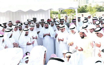خليفة وجموع المشيعين يقرأون الفاتحة على روح المغفور له أحمد بن زايد. وام