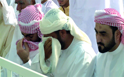 ذوو أحمد برشود الشحي يبكونه بعد دفنه في رأس الخيمة أمس. الإمارات اليوم