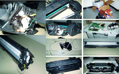 صورة مركبة لمراحل تفكيك طابعة الكمبيوتر التي تحوي مواد متفجرة داخل الحبر الخاص. من المصدر