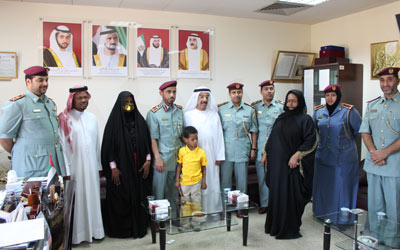 الطفل العماني محاطاً بأفراد من أسرته وضباط من شرطة أم القيوين. الإمارات اليوم