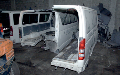 أجزاء حافلات مفككة قبل تهريبها خارج الدولة. من المصدر
