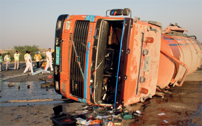 رجال الإنقاذ يرفعون آثار الحادث. الإمارات اليوم