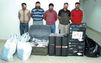 المتهمون الخمسة وأمامهم جانب من المضبوطات. من المصدر