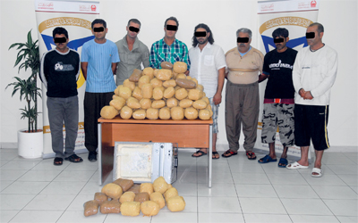 أفراد العصابة وأمامهم المخدّرات المضبوطة وثلاجة مفرغة من الخلف. من المصدر