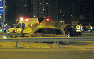 سيارة محطمة إثر حادث وقع في شارع حصة. الإمارات اليوم